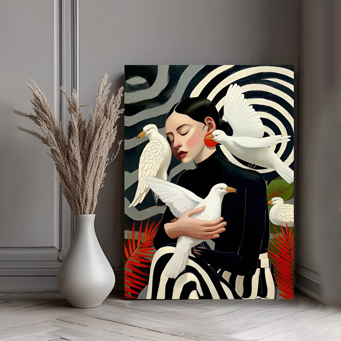 Modern Art Print – Abstract Portrait with White Birds, Black and White Strip